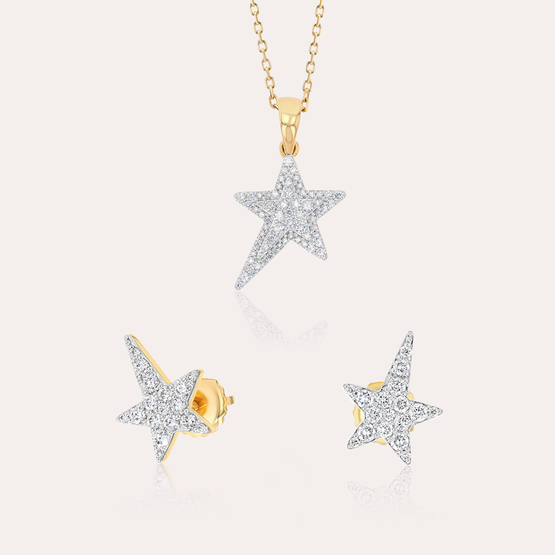 طقم أنيق من قلادة وأقراط مصنوع من الذهب الأصفر عيار 18 قيراطًا، يتميز بتصميم نجمة عصري مرصع بألماس طبيعي براق. مثالي...