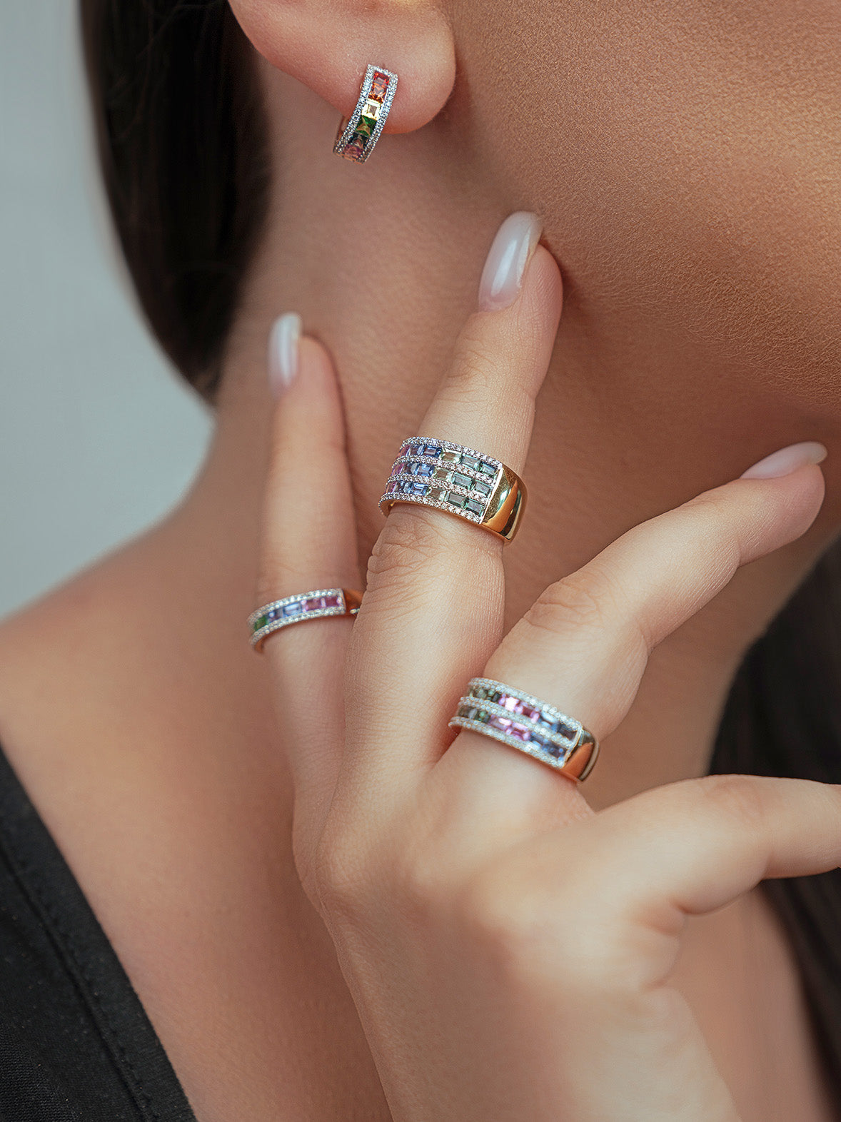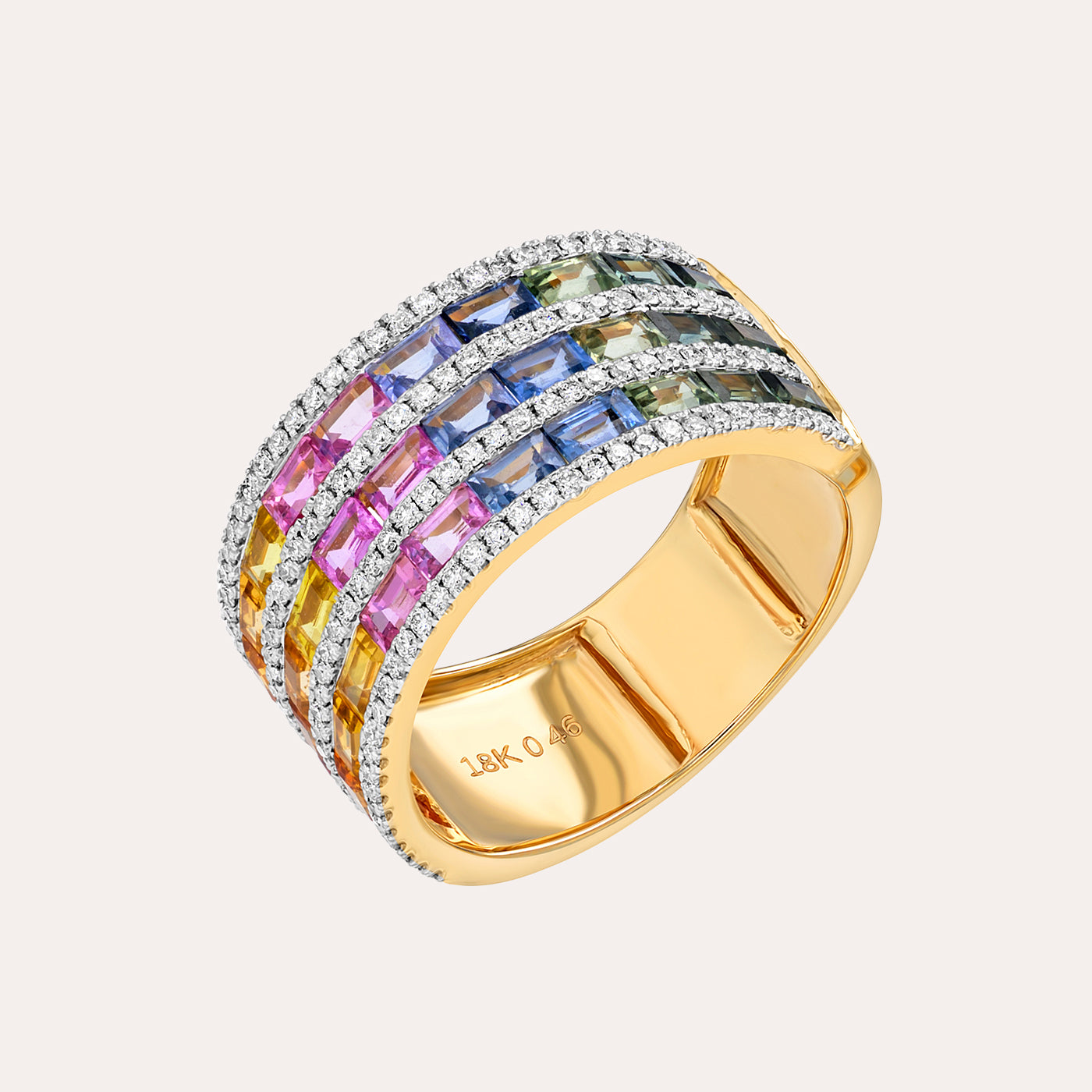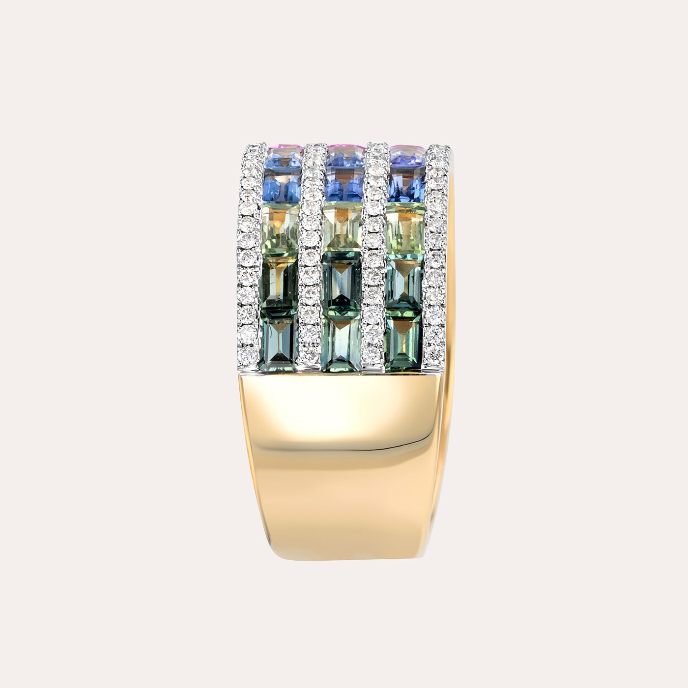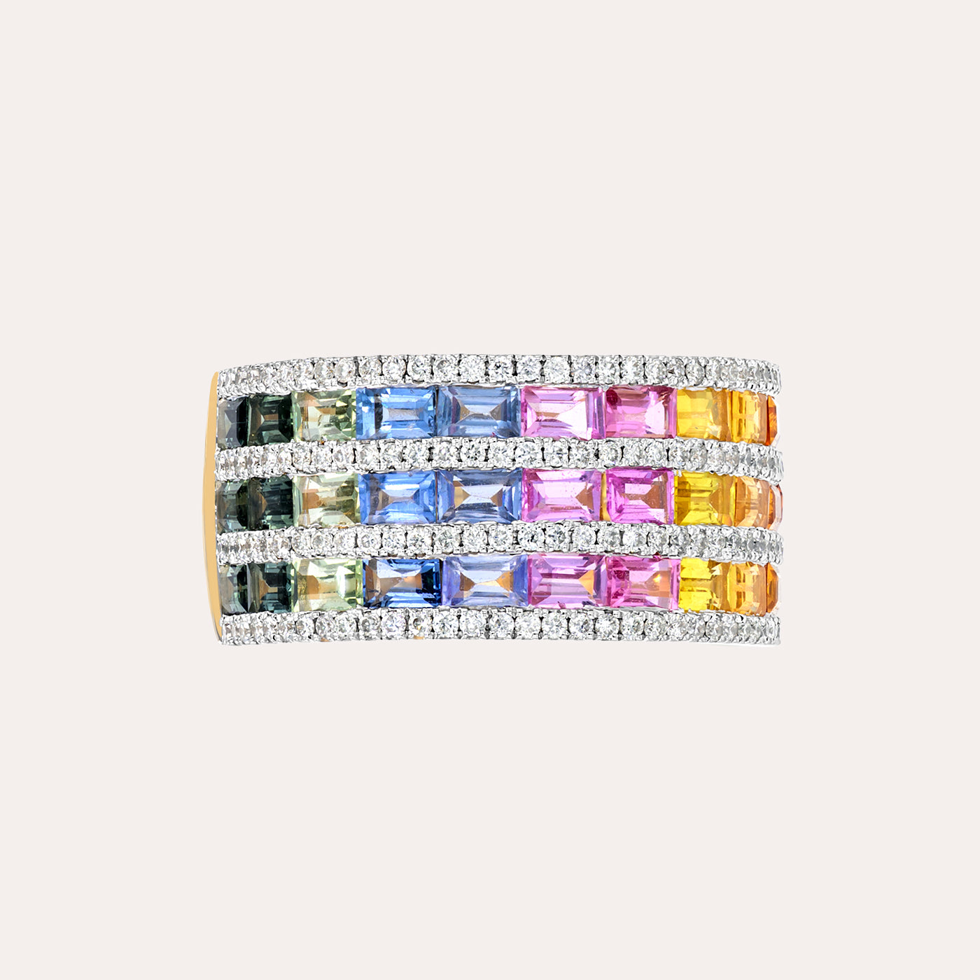 يُجسّد هذا الخاتم الجريء من مجموعة رينبو تعبيراً عن الألوان والفخامة، حيث يتميّز بصفوف متتالية من أحجار الياقوت متعد...