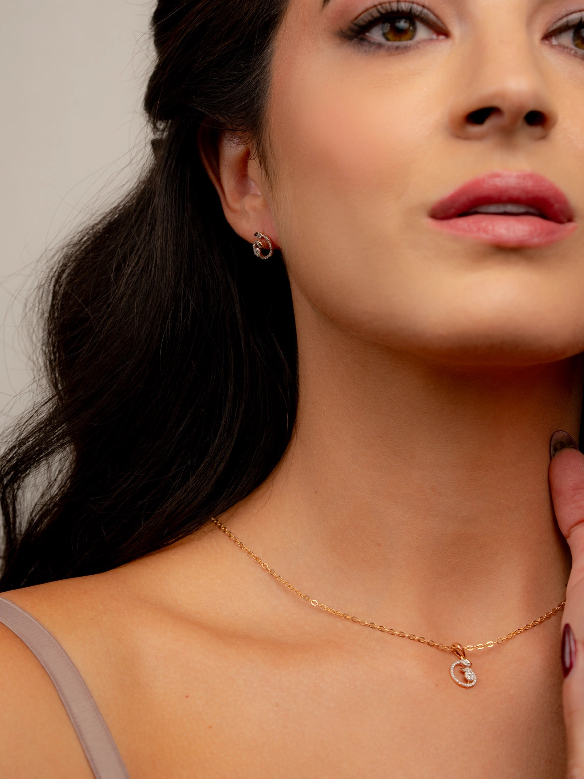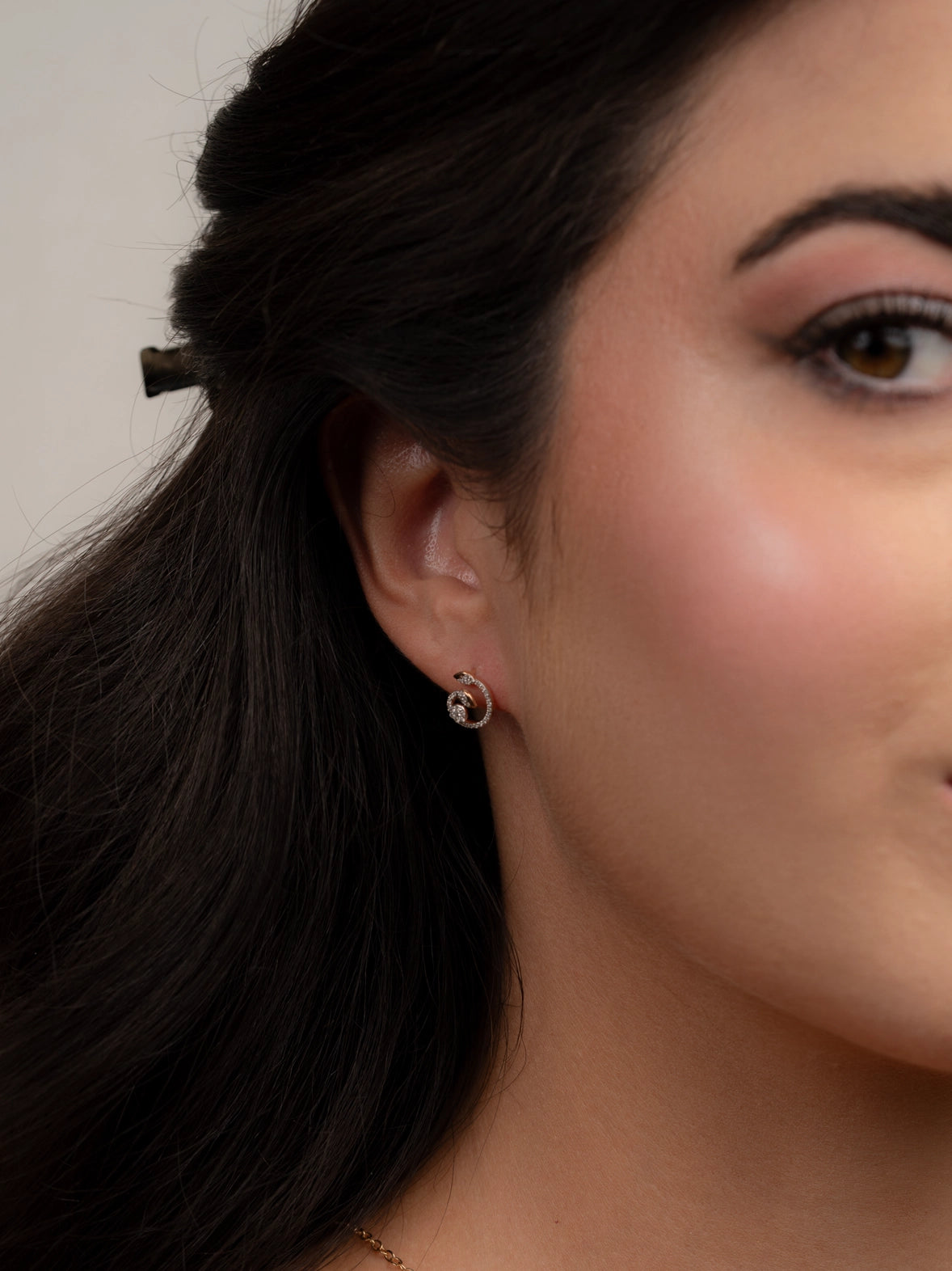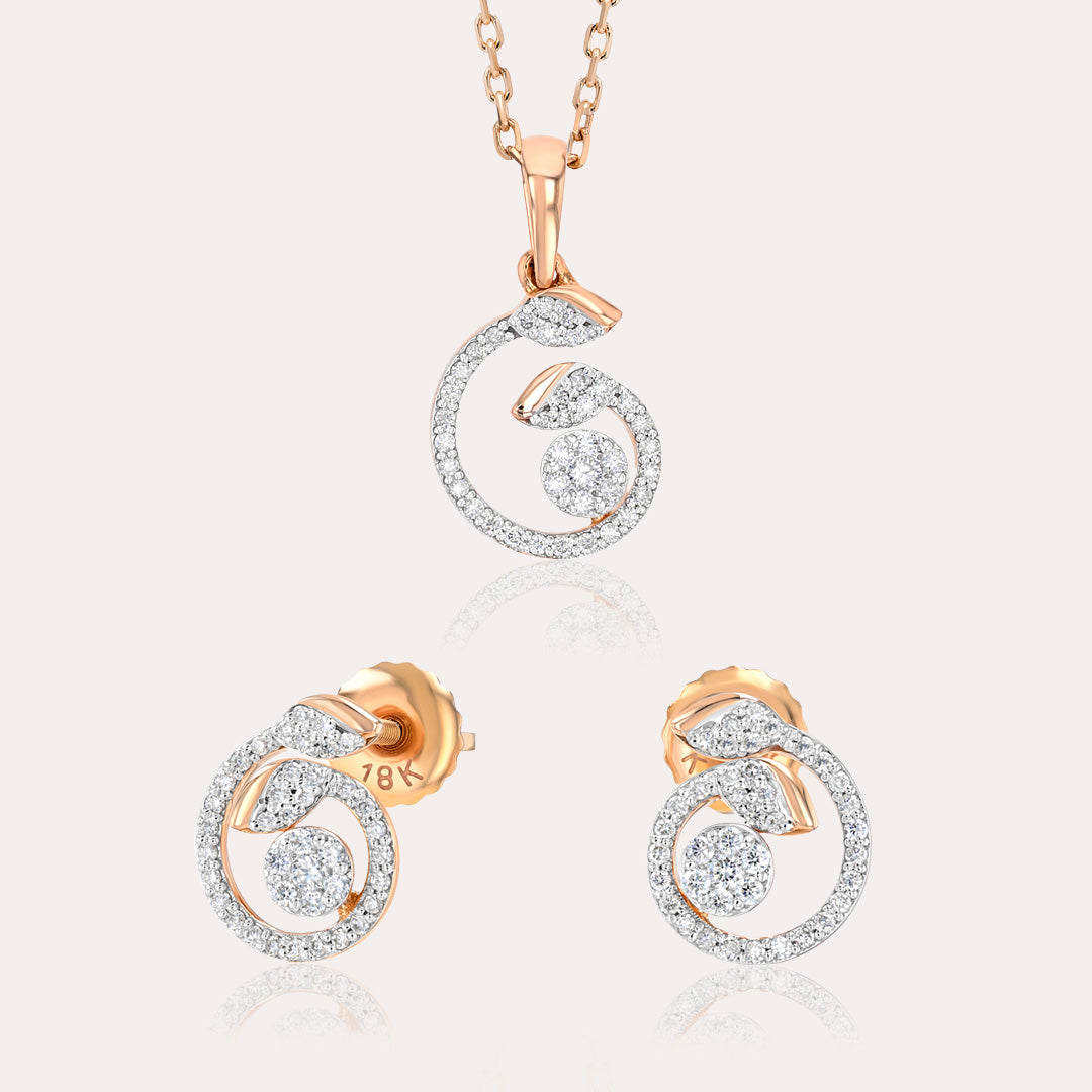 طقم أنيق من قلادة وأقراط مصنوع من الذهب الوردي عيار 18 قيراطًا، يتميز بتصميم حلزوني انسيابي يُبرز التألق الطبيعي للألماس المرصع بدقة. يتميز هذا الطقم بأناقته وتعدد استخداماته، مما يجعله مثاليًا للارتداء اليومي الراقي.