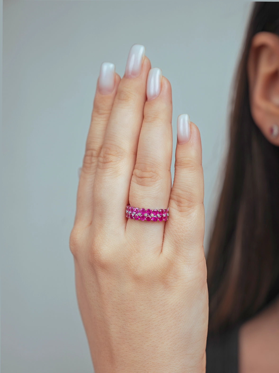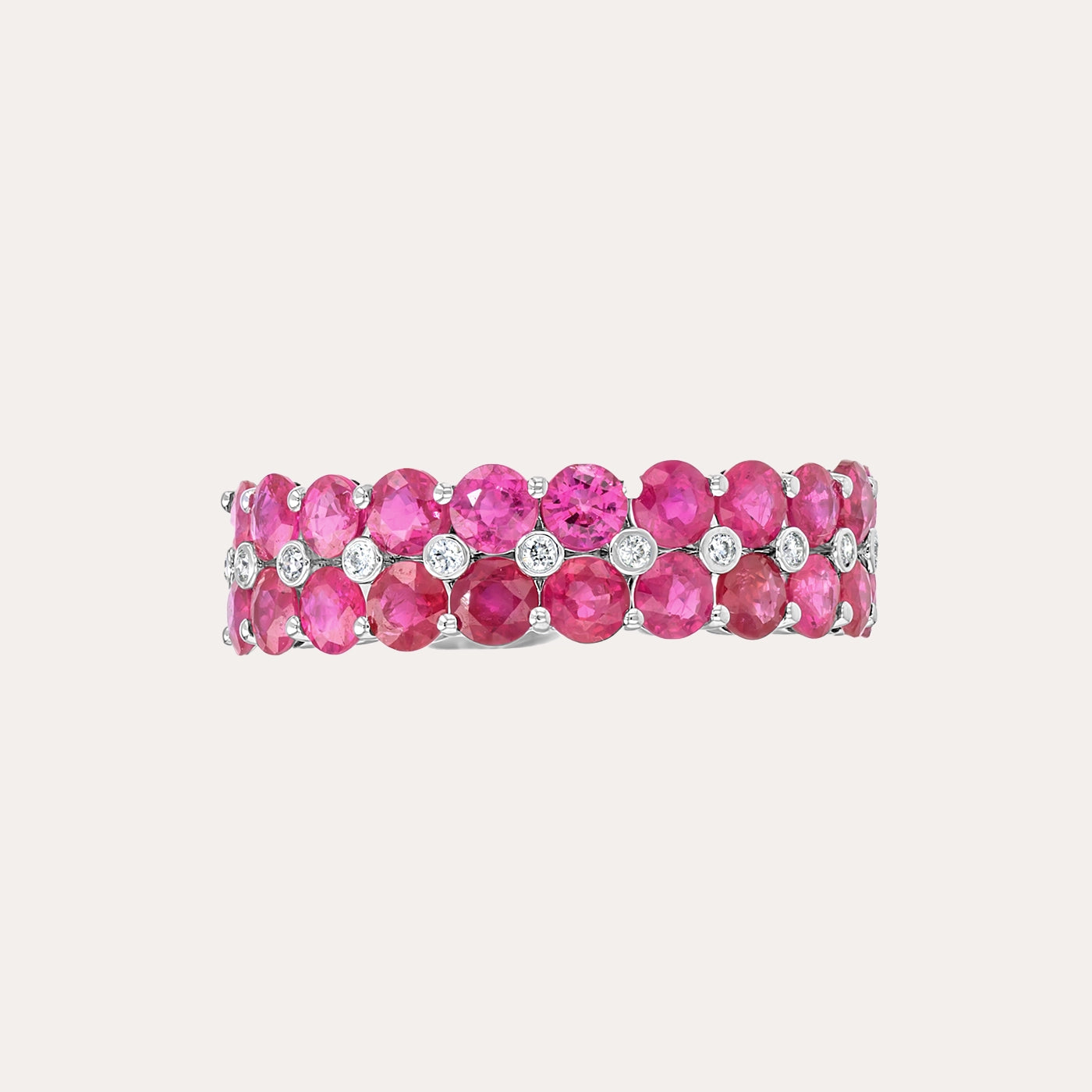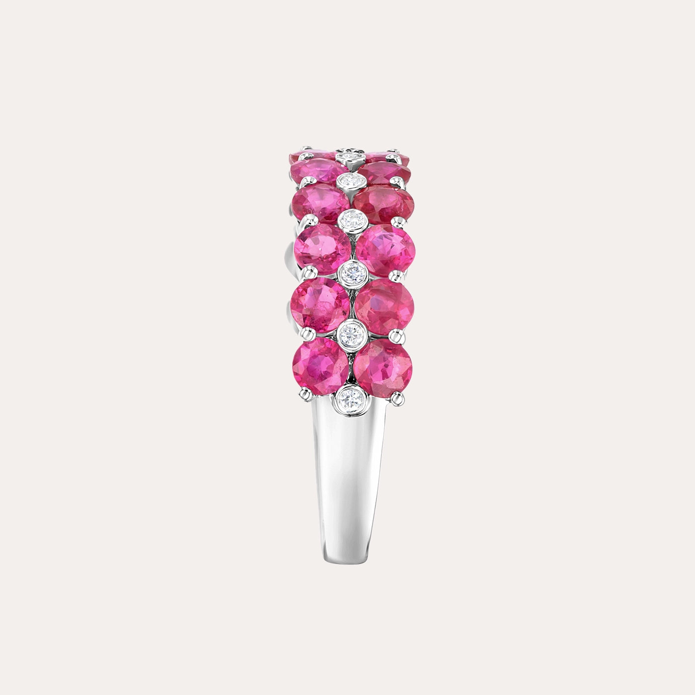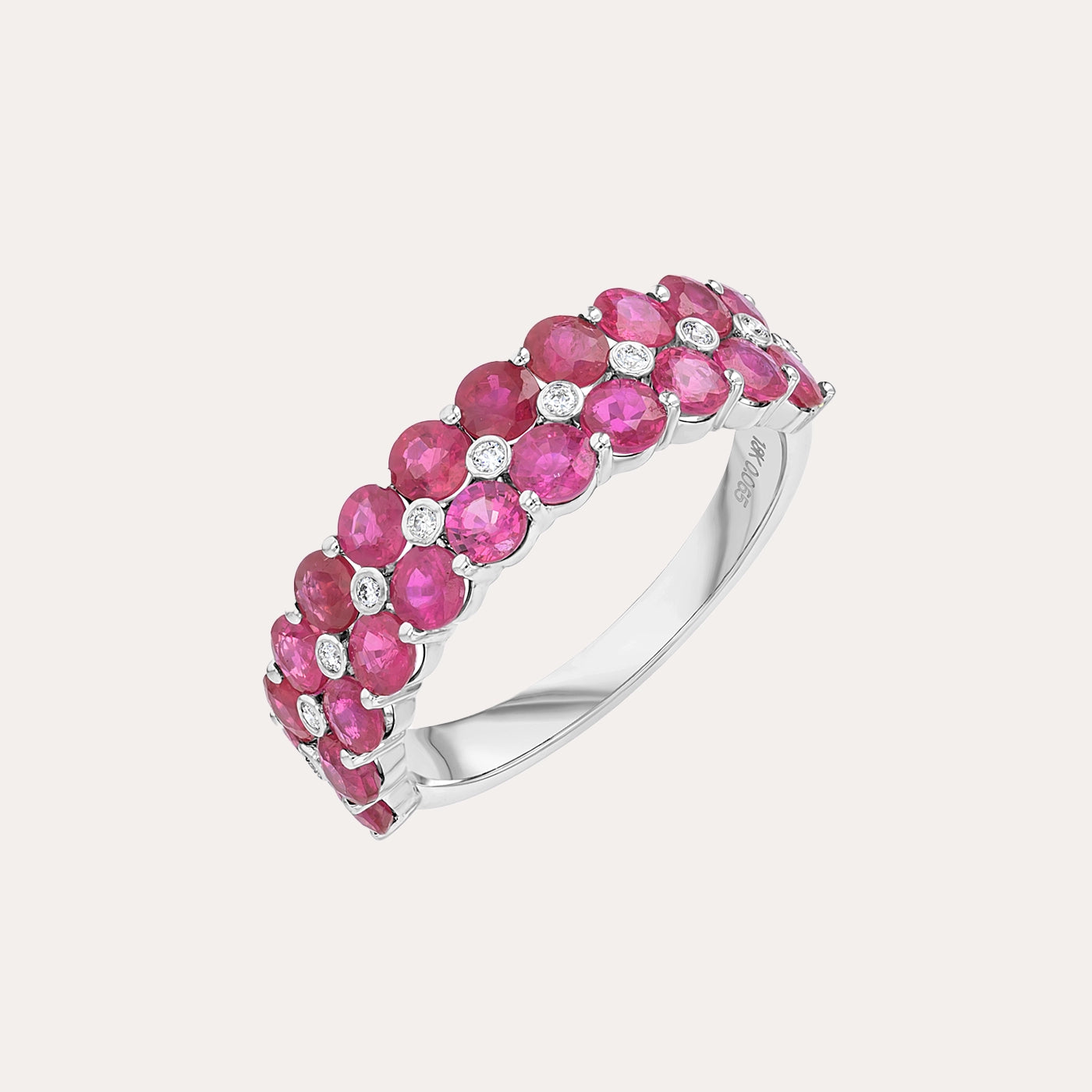خاتم أنيق بتصميم كلاسيكي، يتألق بصف متواصل من أحجار الياقوت الأحمر البيضاوية الزاهية، مُرصّع ببراعة بألماس دائري لام...