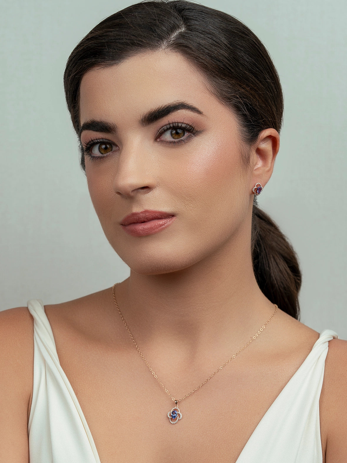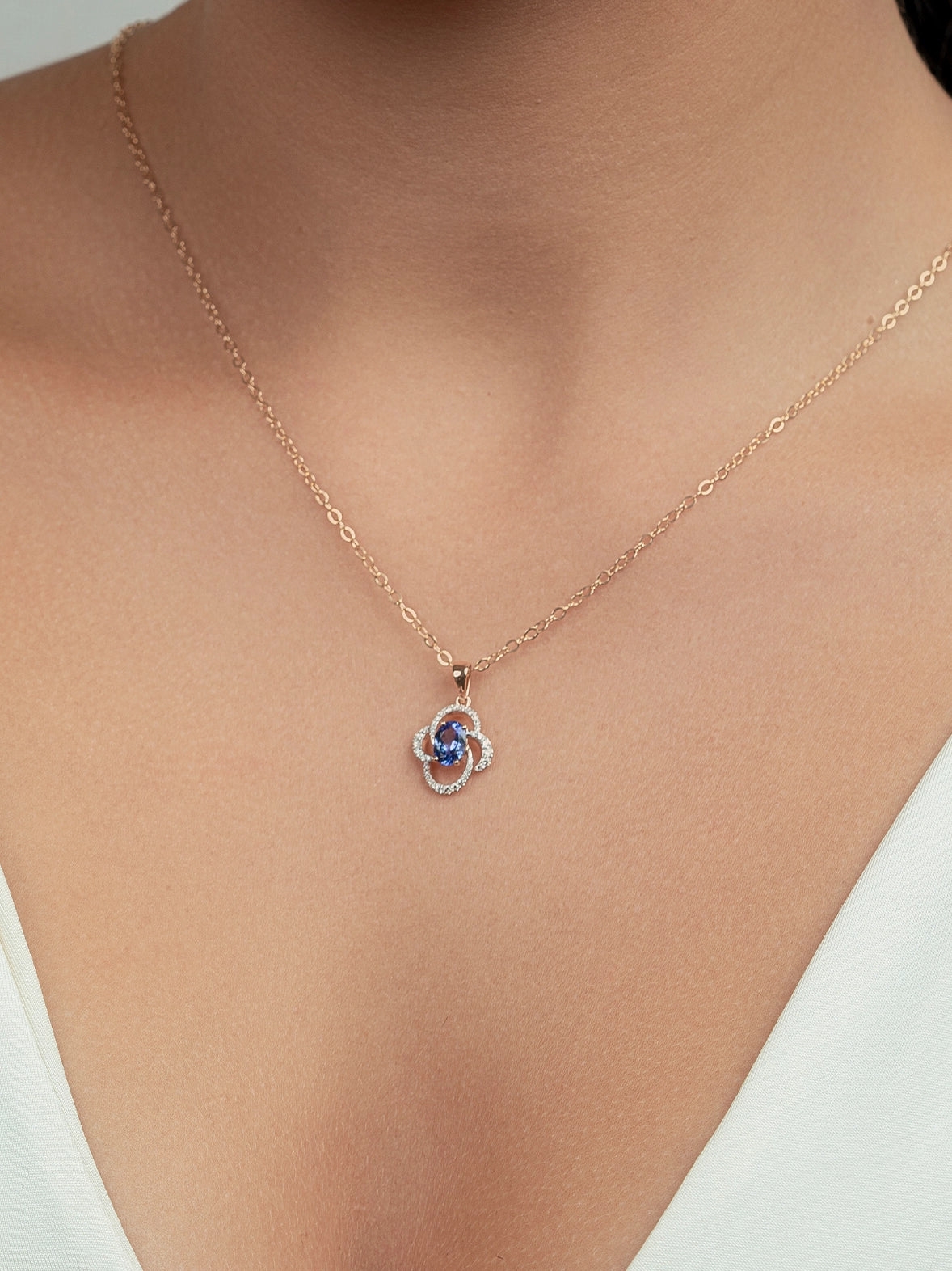 تتميز هذه القلادة الأنيقة بحجر تنزانيت بيضاوي الشكل نابض بالحياة في المنتصف، محاط بإطار زهري رقيق مرصع بألماس براق. ...