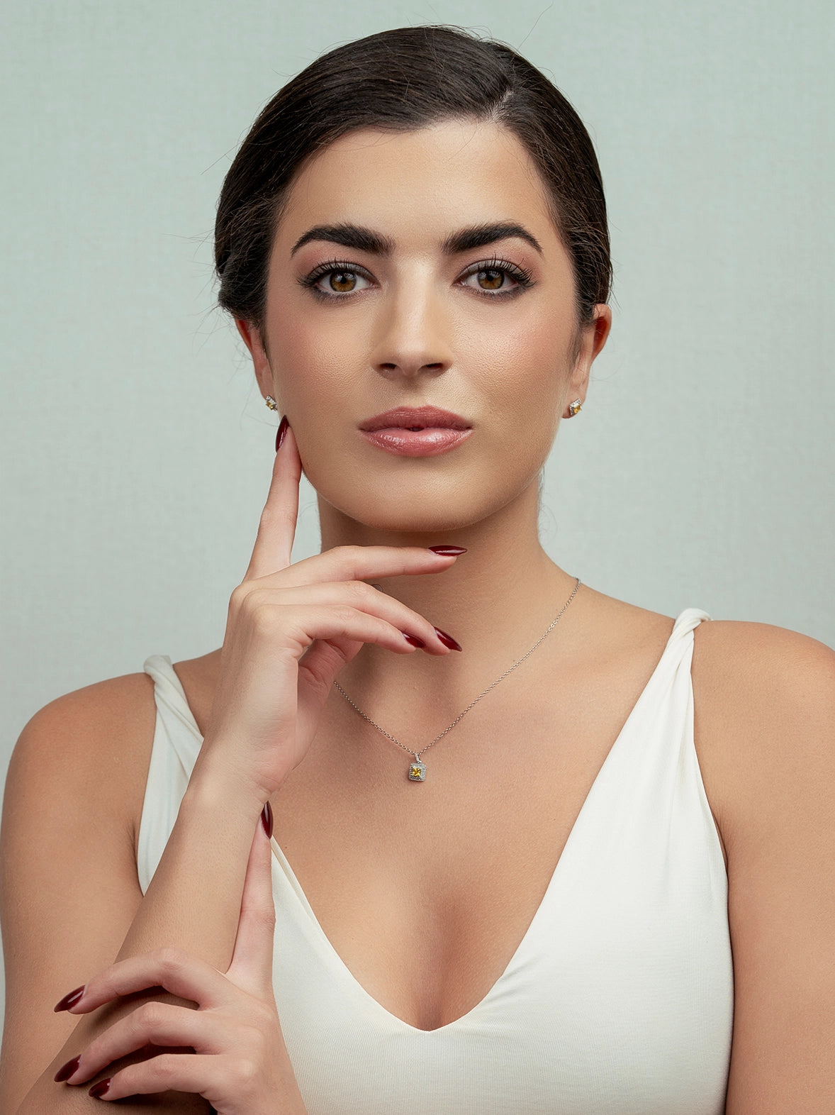 طقم أنيق من قلادة وأقراط مصنوع من الذهب الأبيض المصقول عيار 18 قيراطًا، يتميز بأحجار الياقوت الأصفر النابضة بالحياة والمرصعة بألماس طبيعي براق. يتميز هذا الطقم بأناقته وتألقه، ويضفي لمسة لونية رقيقة متوازنة مع رقي خالد.