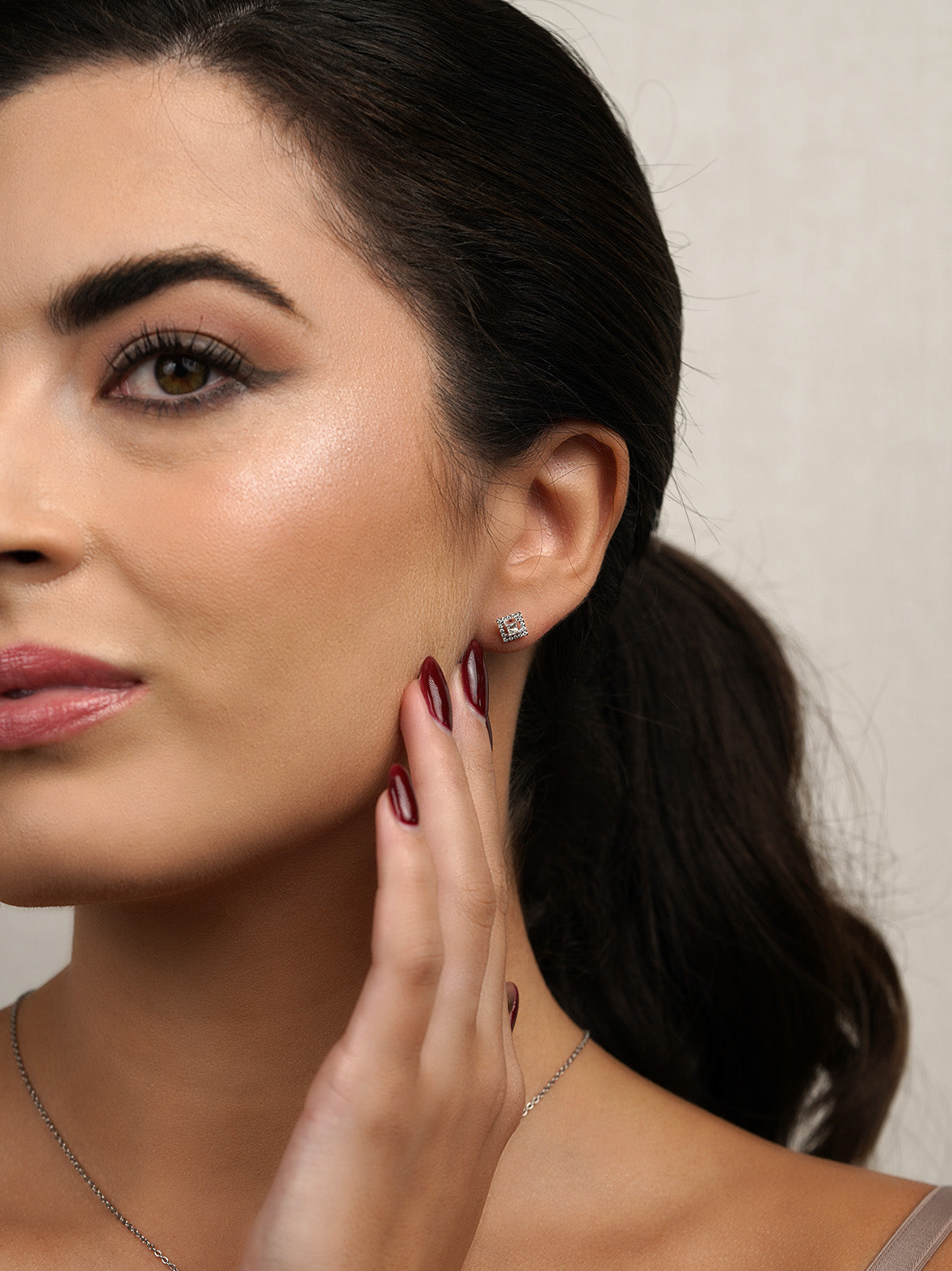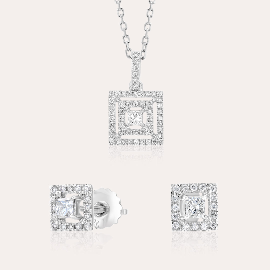 A modern pendant and earring set crafted in sleek 18k white gold, featuring a clean geometric square design accented with natural diamonds. Contemporary and refined, this set is ideal for everyday elegance with a bold, structured touch.