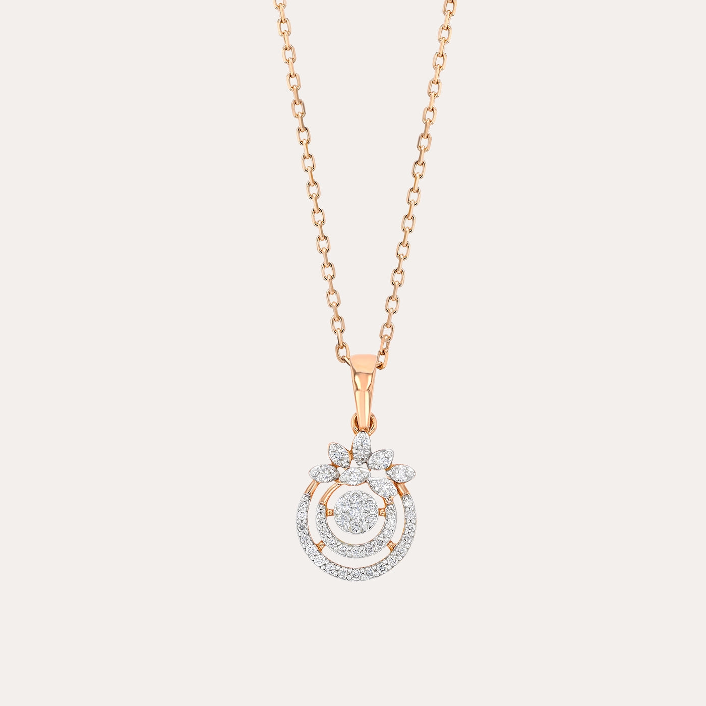 A refined diamond pendant crafted in 18k yellow gold, featuring concentric halo detailing and floral inspired accents set with 0.23 carats of brilliant diamonds for a sophisticated and graceful statement from Esna Jewellery.