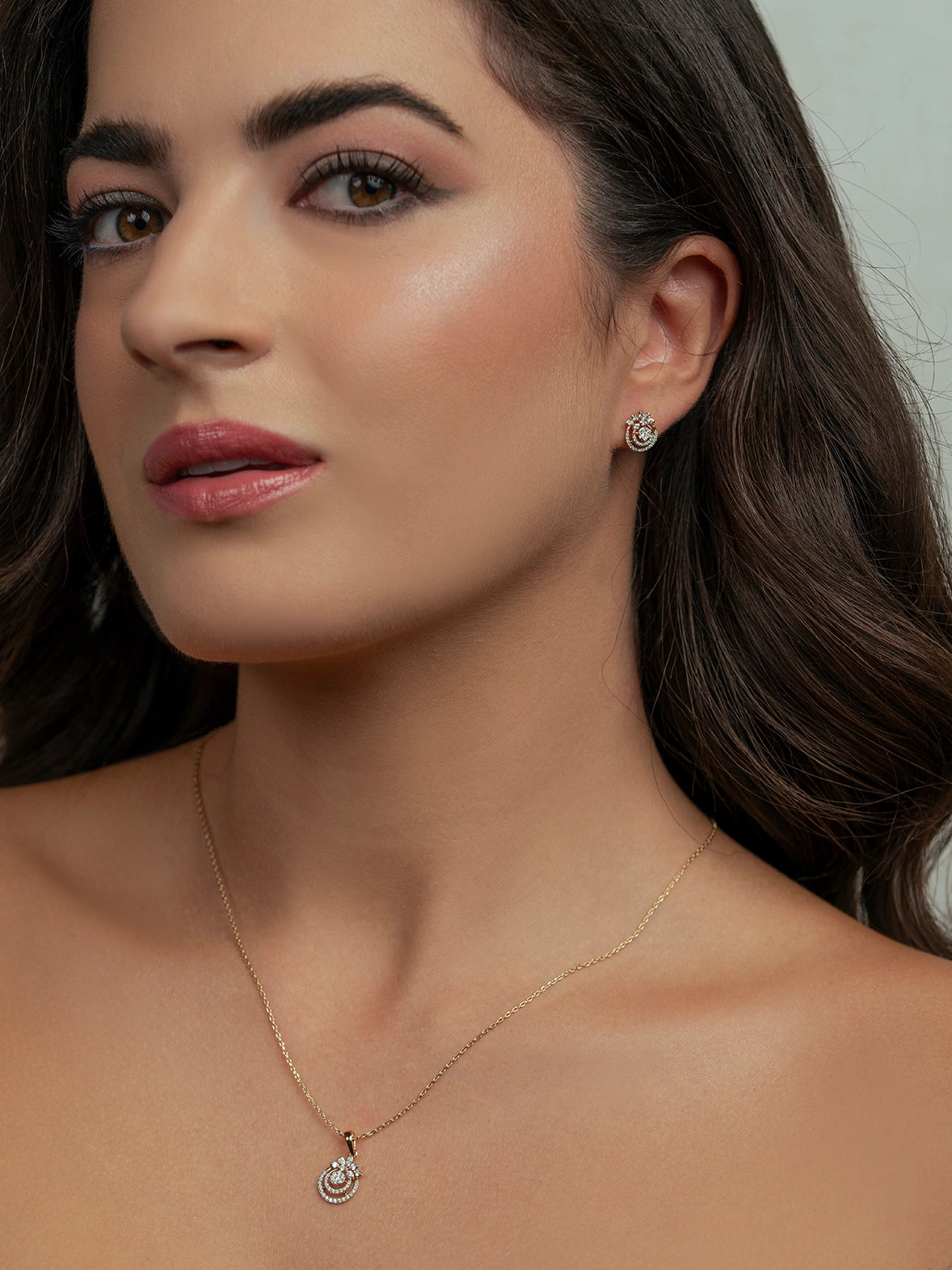 Graceful and luminous, the Golden Halo Bloom Diamond Pendant features an elegant circular design crowned with delicate petal inspired diamond accents. Crafted in warm 18k yellow gold, concentric diamond halos draw the eye toward a radiant center, creating depth, movement, and refined sparkle. A timeless piece that blends floral charm with modern elegance, perfect for both everyday wear and special moments.