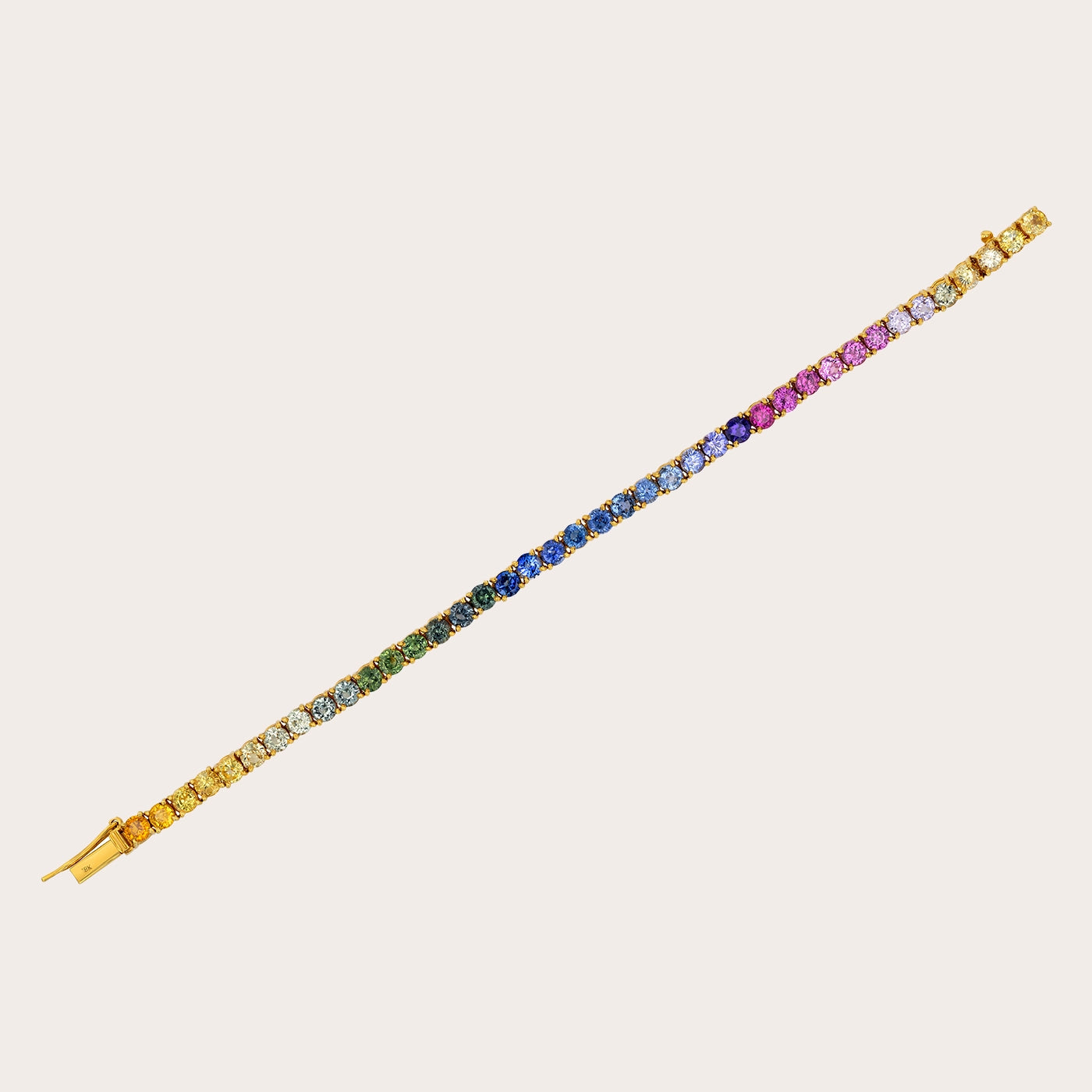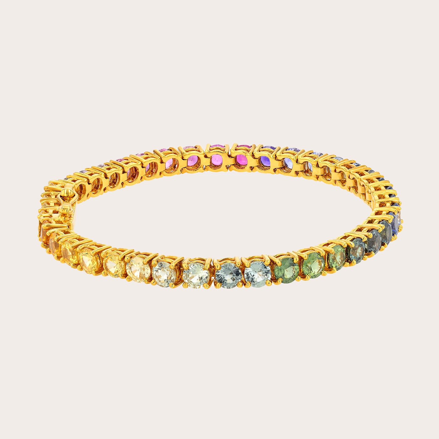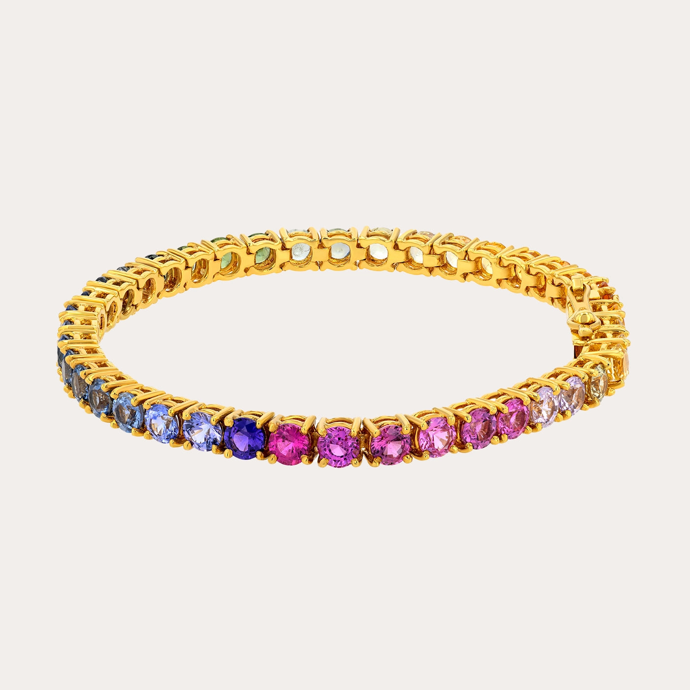 A high jewellery bracelet crafted in 18k yellow gold, set with 40 precision cut multicolor sapphires totaling 13.35 carats, offering vibrant color and refined elegance.