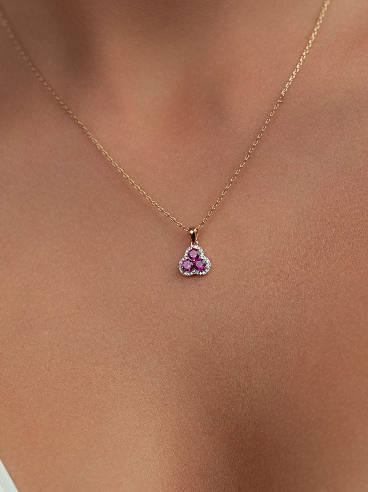 A feminine gemstone pendant crafted in 18k rose gold, featuring vibrant rhodolite gemstones accented by delicate diamonds for a graceful and elegant statement from Esna Jewellery.